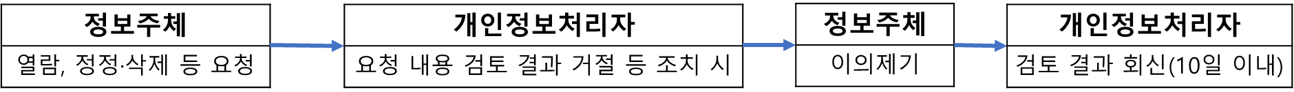 ⑦ (이의제기 방법·절차) 정보주체는 개인정보 열람, 정정·삭제, 처리정지에 대한 조치에 불만이 있거나 이의가 있을 경우에는 개인정보 보호담당자에게 이의제기를 할 수 있습니다. 한국항로표지기술원은 이의제기를 받은 날로부터 10일 이내에 내용을 검토한 후, 그 결과에 따라 조치하고 개인정보 이의제기 요구에 대한 결과를 정보주체에게 안내드립니다.
